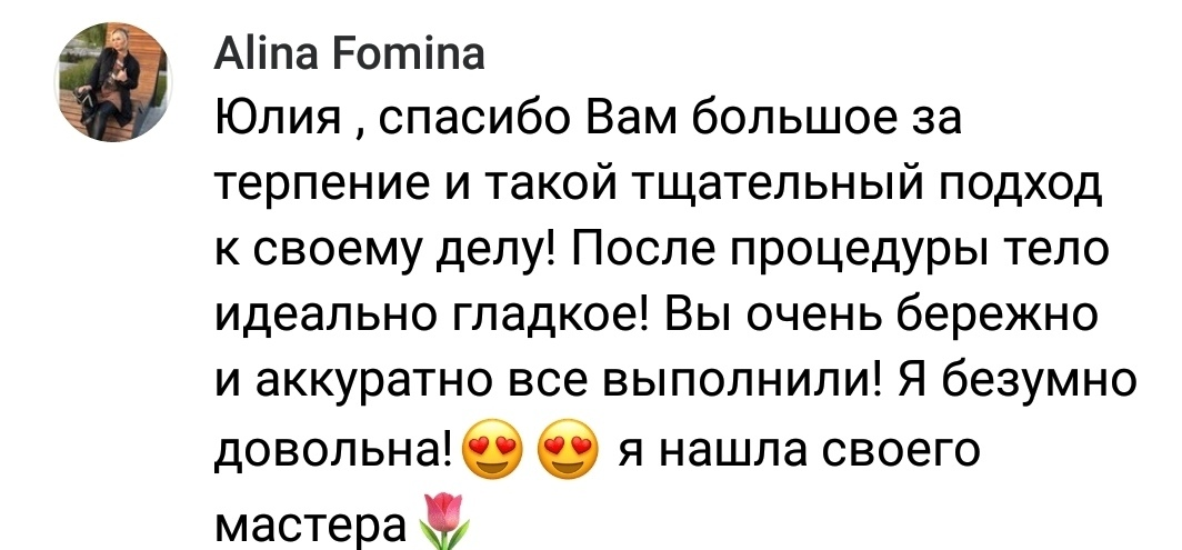 Наша главная ценность - комфорт и уверенность клиентки. Поэтому фактическое время процедуры может меняться в зависимости от сложности работы, чувствительности кожи, Вашего болевого порога и психологического настроя. Указано время пребывания в студии, на которое Вы можете рассчитывать. Мы не опаздываем и не отменяем встречи.